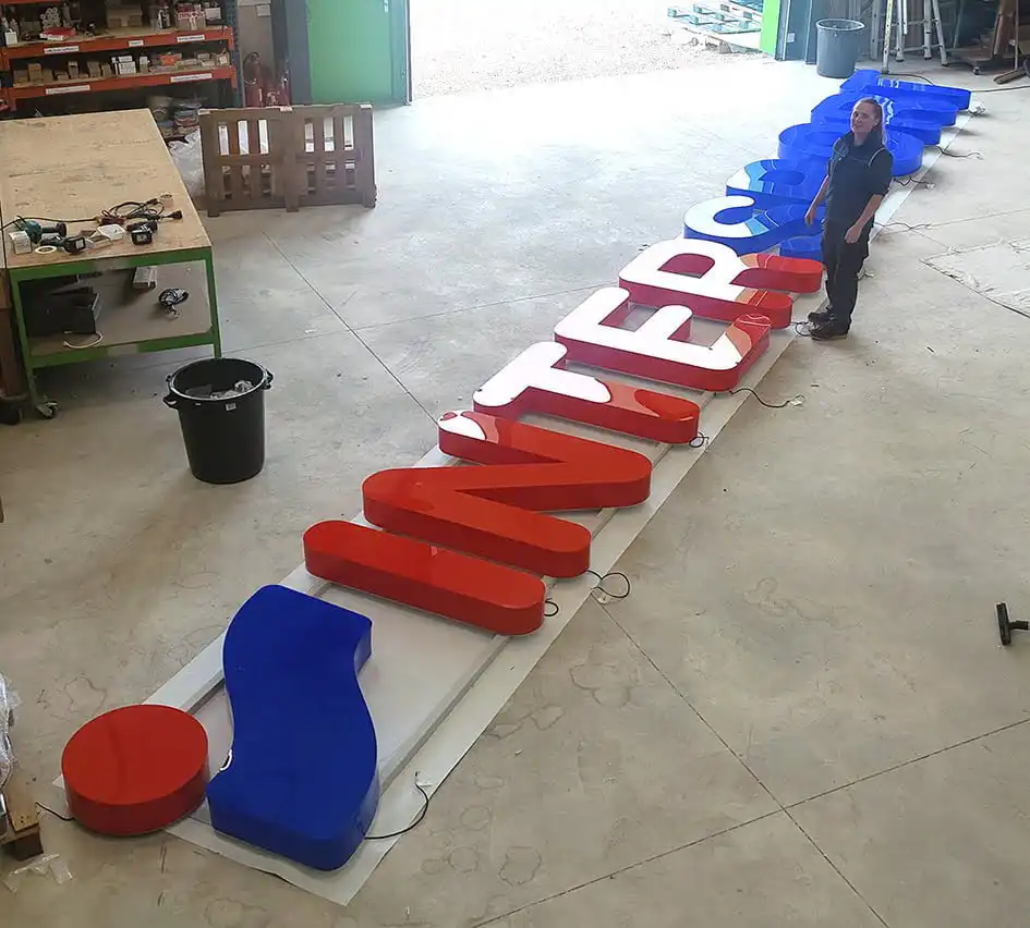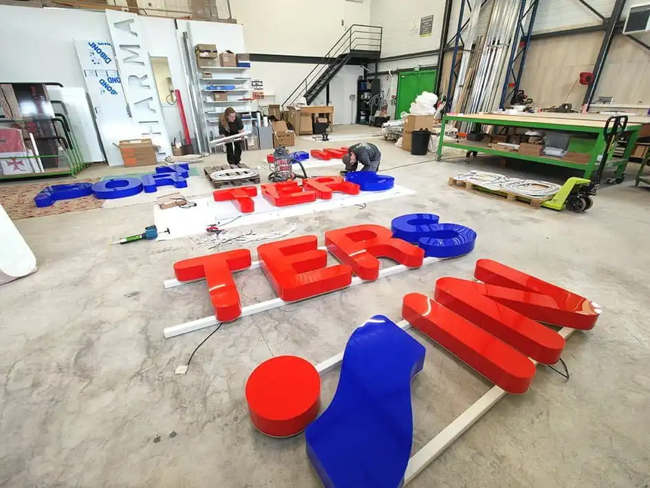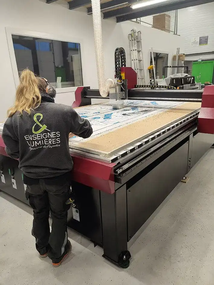 - La Fabrication des divers éléments : Une fois les matériaux sélectionnés, les différents éléments de l’enseigne sont fabriqués. Cela peut inclure la découpe des panneaux, l’impression des visuels, la fabrication des lettres en relief, l’installation des systèmes d’éclairage, etc.
