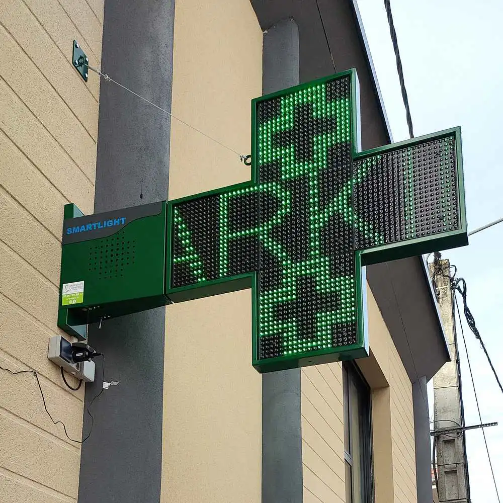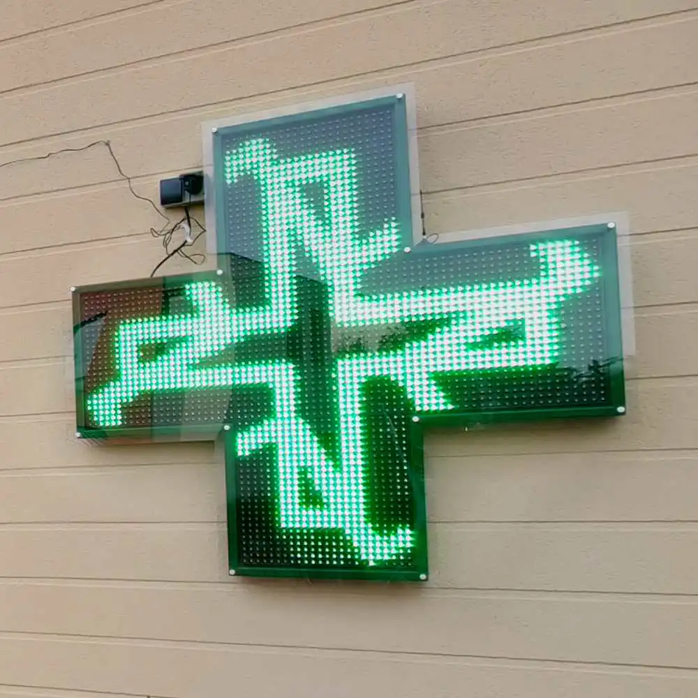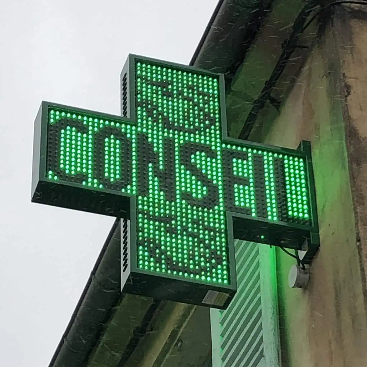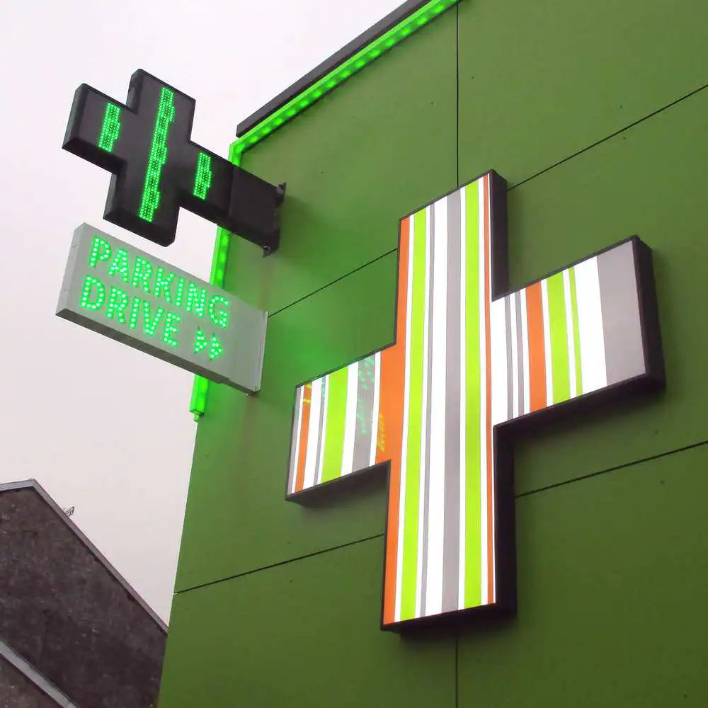 Croix de pharmacies à diodes, l’enseigne parfaitement visibles en extérieur quelle que soit la luminosité.